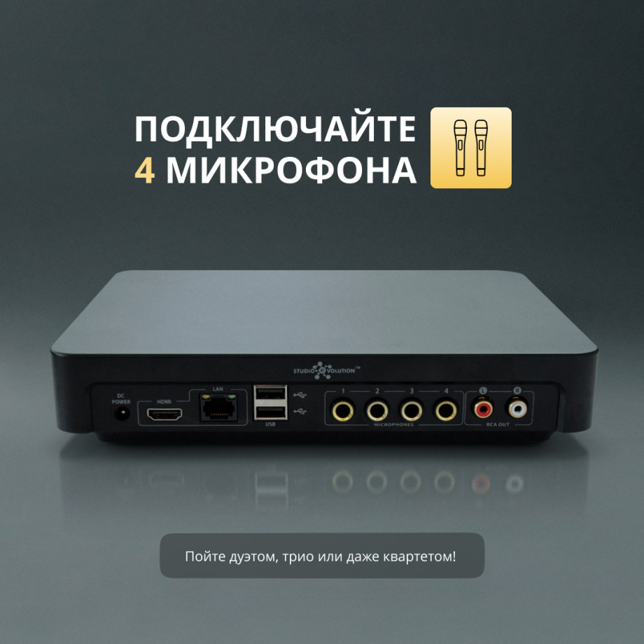 Чем больше звучит голосов, тем веселее вечеринка. Подключайте к EVOBOX Premium три или даже четыре микрофона и пойте любимые песни всей компанией. Индивидуальная настройка микрофонов поможет добиться гармоничного звучания всех исполнителей в квартете или выделить голос солиста и сделать его громче.